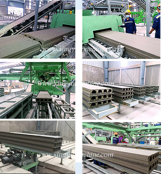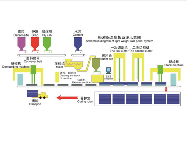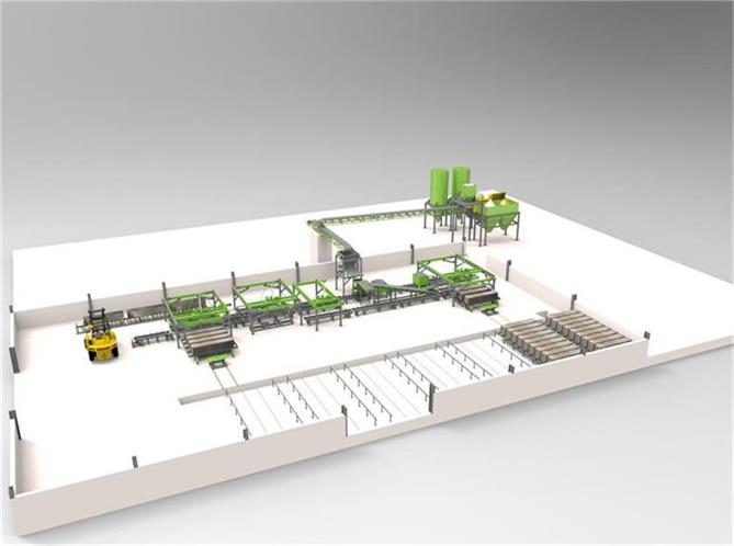 該生產(chǎn)線由專有模具設(shè)計,自動計量配料、密封輸送、連續(xù)干混、強制濕混、托板自動上板、板料輸送、高性能連續(xù)擠出、成型控制、伺服同步追蹤、自動切割、質(zhì)量在線視覺分析,自動碼垛,叉車運轉(zhuǎn),自動養(yǎng)護,溫濕度控制、自動成品拆模,中央總控計算機系統(tǒng),等主要部分組成。